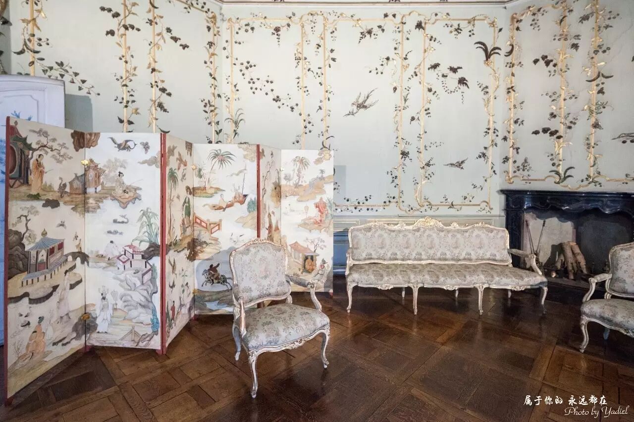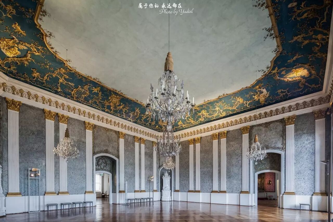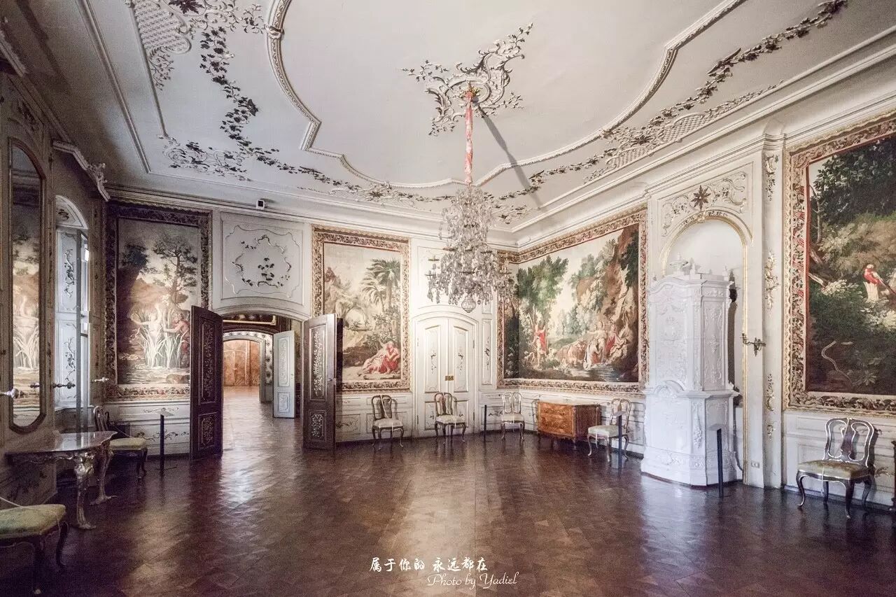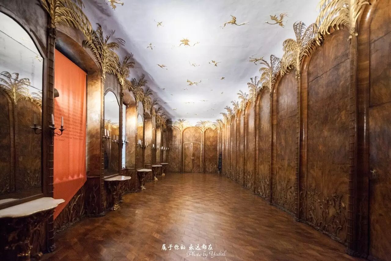 棕榈室是新宫内的最著名的厅室,相当于凡尔赛宫的镜厅。棕榈室是皇族会议室,墙上是精致的核桃夹板装饰,为洛可可式风格的精华之一。几盏豪华水晶灯给厅室增色不少。其他房间从视觉效果角度看,也许都比这两个厅室豪华,但是都是欧洲宫殿装饰的惯用手法,而这两个厅室的装饰手法则在欧洲其他宫殿中不多见,值得品味。