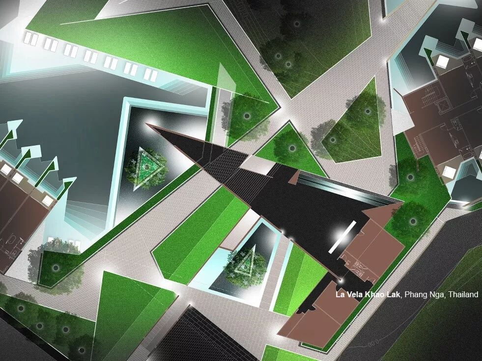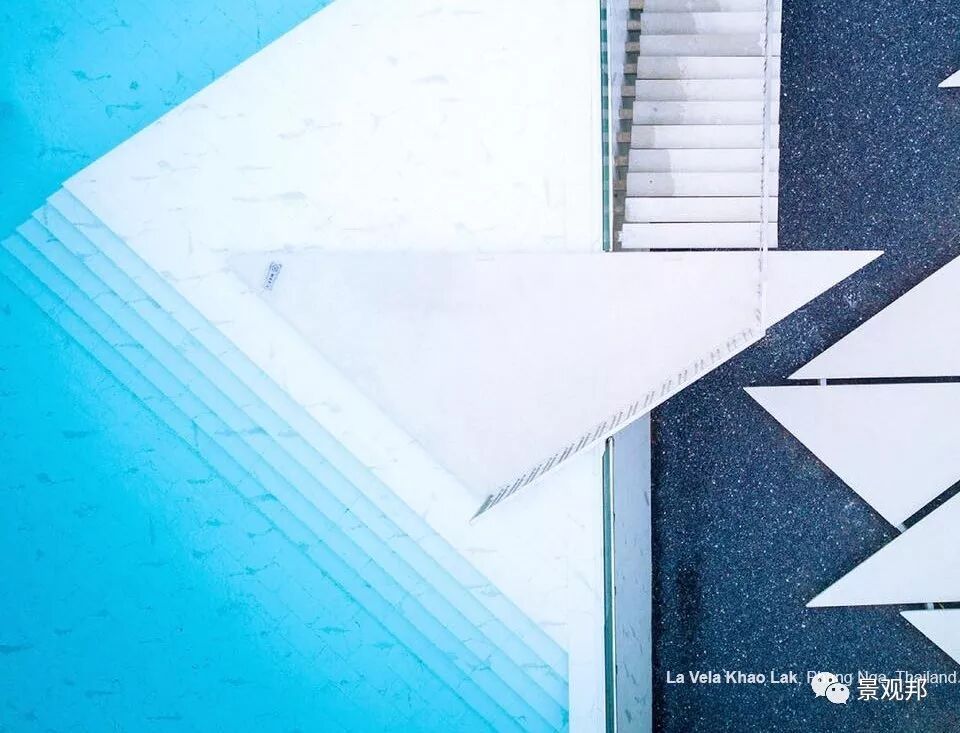 景观设计的轮廓与建筑、室内一样,也遵循船帆座的形态。这映射到地面的星座,一直都在指引着人们开启一段奇妙旅程。景观设计最初的轴线,来自于建筑之间错落交织的线条,也与最初落成的沙滩会所建筑形态相符合。巧合的是,这种场地上天然形成的三角形,随着项目的落成,与La Flora集团其他两个项目地图坐标也构成了一个大三角。