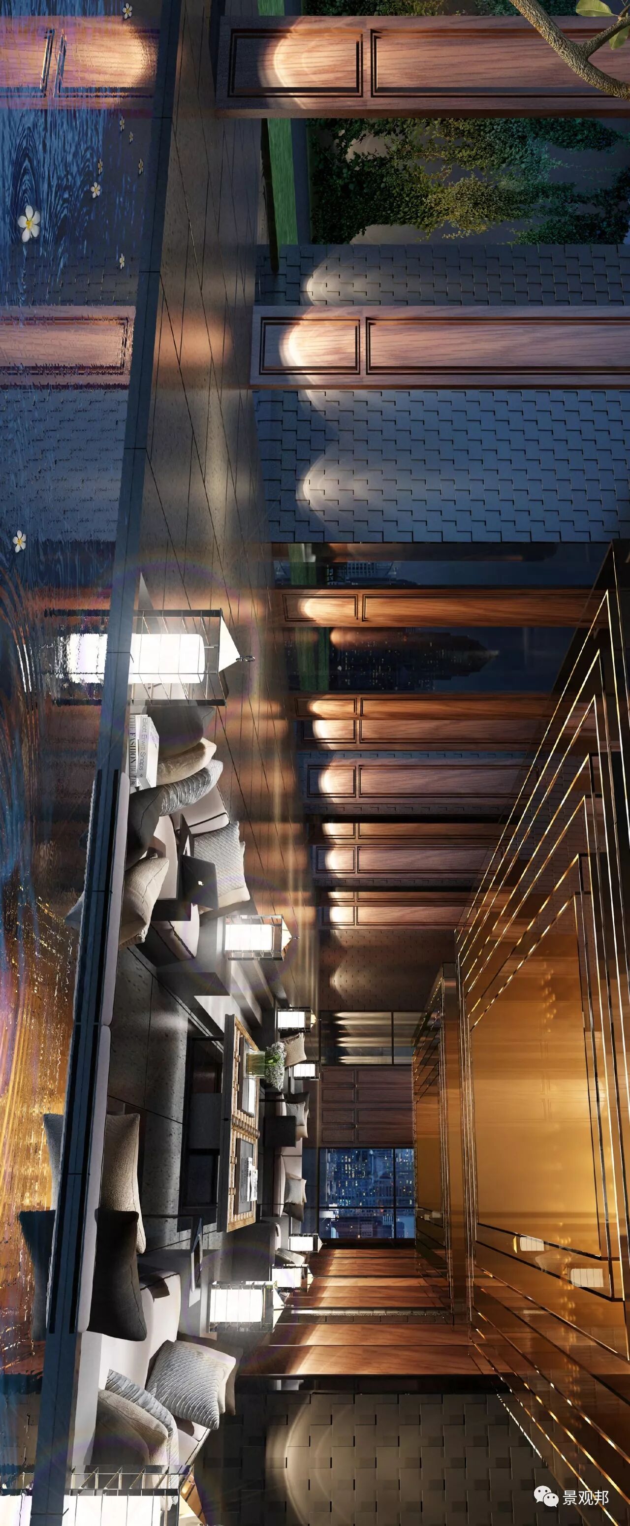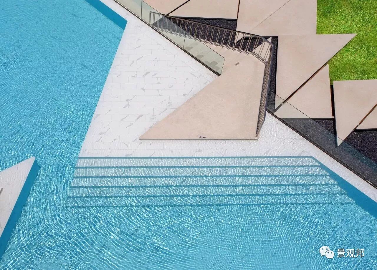 场地主入口的设计,修改了原有U型半围合建筑布局,将中规中矩的布局翻为一个向上抬起的三角形平台,站在平台上即可将泳池景观尽收眼底。在抬起的平台下方,借高差形成的落水景观与泳池融合在一起,形成了大堂的一道景观。游客与不同的体验,就从这里开始。大堂的内部装饰也延续了这种语言。