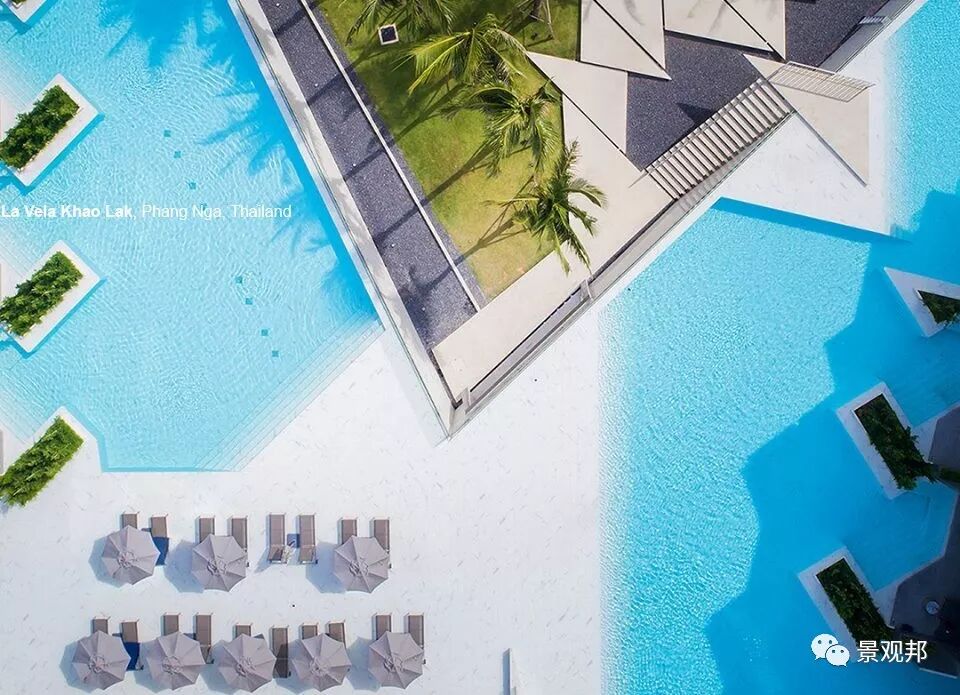 La Vela场地主要分为三部分,入口区,沙滩花园和泳池花园。