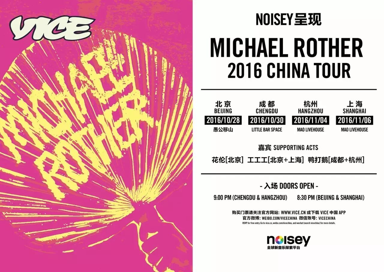 2014年 VICE Party,我们有幸邀请 Michael Rother 成为演出嘉宾。如果你没去成那次超级完美的京沪演出,这次“2016年 Michael Rother 中国巡演”将是你不能错过的机会!