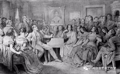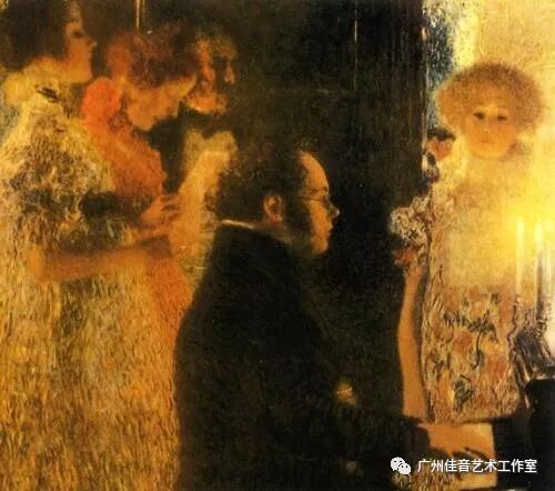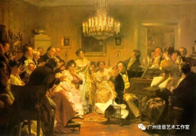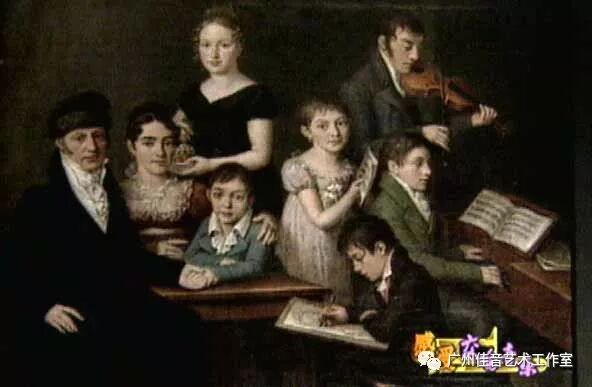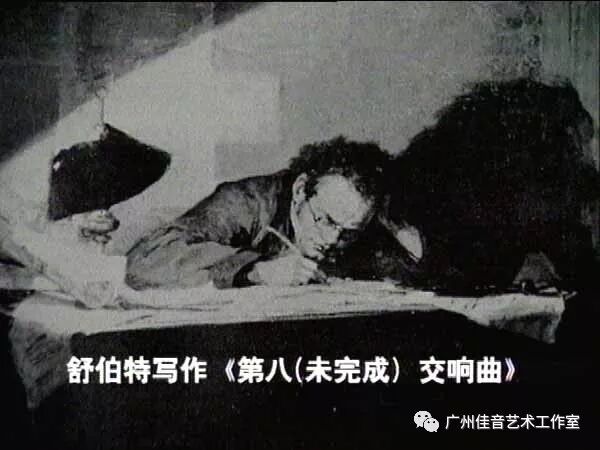 下面介绍一下舒伯特的家庭,我一直认为一个人的家世背景和生活环境对一个人的影响意义深远。舒伯特的父亲是维也纳郊区的一个小学教员,家境虽贫寒但使幼年的舒伯特得到了一个能学习钢琴,小提琴,并能演奏四重奏的良好的音乐环境。1808年舒伯特考入维也纳皇家礼拜堂少年唱诗班,在教会附设学校里接触到管弦乐队的实践及海顿莫扎特的作品。1810年后舒伯特辞去教职工作到维也纳去当”自由“艺术家。舒伯特从此没有了固定收入,全靠买自己的作品为生。舒伯特常与朋友同住,不时地得到一些热爱它歌曲的朋友(其中也有贵族朋友的接济),围绕在舒伯特周围的经常是志趣相投的青年人,其中有音乐家,有诗人,画家,律师等音乐爱好者,他的朋友虽然在不同时期有所变化,但舒伯特永远是这个圈子的中心。被称为”舒伯特小组“的男女青年,在一起读书演戏,散步郊游,彼此争论艺术问题,探讨奥地利音乐艺术的特质,聆听或演奏,是在朋友中首次演出然后流传出去。舒伯特逝世后的60年代里,有关所有他所经历的这些特殊生活情境,被小组里的画家用画笔生动地描绘出来。可以说舒伯特是第一位真正以自己的精神产品换取生活资料的作曲家,是西方音乐史上第一位“自由音乐家”,直到1821年他才第一次出版自己的歌曲《魔王》,之后虽继续出版作品,但始终收到出版商的剥削。大量作品是在舒伯特死后才被搜集,整理并出版《未完成交响曲》《第九教学曲》三重奏等著名作品,都是被舒曼门德尔松挖掘出来才得以演出。