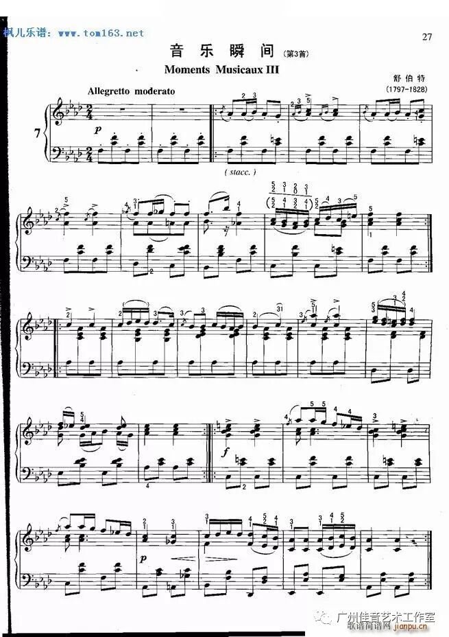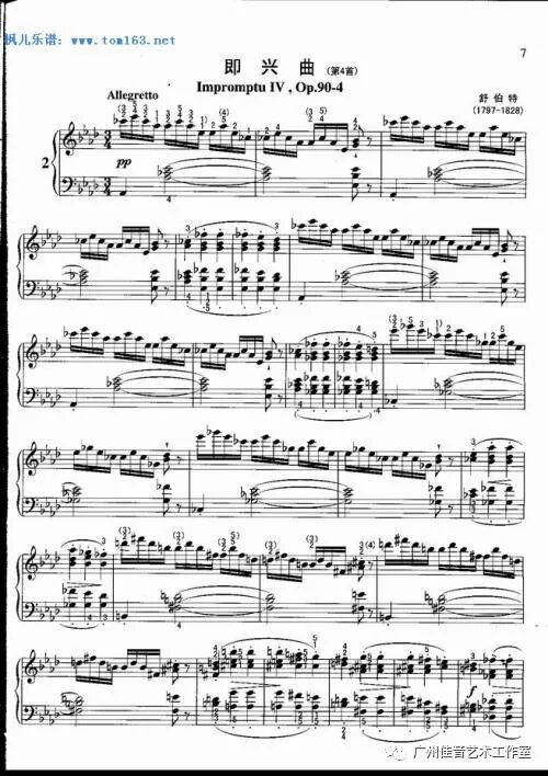 舒伯特的钢琴创作包括奏鸣曲,幻想曲,特性小曲,圆舞曲,大量为二手或者四手联弹的进行曲,变奏曲等。其中特性小曲和一些舞曲是舒伯特为钢琴所做的特殊贡献。舒伯特偏爱小品这种传达方式,因为它与音乐的情感性,个体性贴切吻合。虽然将一些小曲定义为“即兴曲”或“音乐瞬间”是出版商的主意,但舒伯特的乐曲确实是在强调无准备的突然而至又瞬间即逝的灵感,每首的结构不同,比较简单自由,旋律如她的歌曲抒情迷人,这下小曲就像一幅精工细琢的的诗情素描。