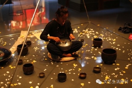 早早来到798的白玛梅朵艺术中心,活动尚未开始,工作人员还在布置现场。展厅中间有一个四棱锥的金属框架,地上零落地铺洒黄白花瓣,简单的几何图形让人联想到空心的金字塔。几位音乐人坐在其中,安静地摆弄着造型各异的乐器。