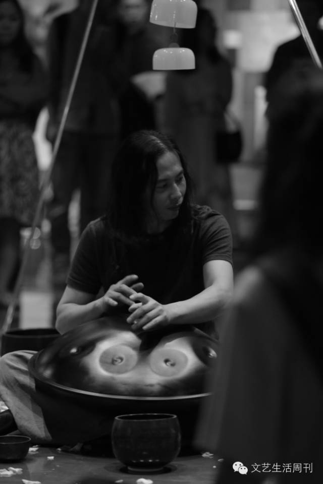 在旁休息的音乐人逐渐加入,Hang的声音通透清脆,澳洲土著的迪吉里度管浑厚沉稳,一连串水晶声磬像环绕演奏者的行星,发出曼妙宇宙的律动,没有歌词的吟诵又仿佛来自古老神庙。