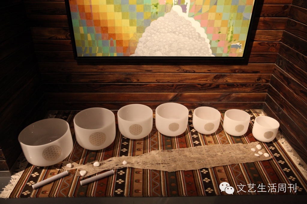 信步于展厅中,每一件闻所未闻的乐器都令我充满好奇和期待之心。它们曾经是一捧泥土,一方水晶,一棵树,一口锅,一只水碗,一把铁锤。它们或许来自寻常生活,或许来自山川湖海、旷野森林。此刻,它们只是被摆放在地上或展柜里,仍然默默地以匪夷所思的能量影响着我的心。我被一只镌刻着《心经》的水晶钵吸引,晶莹的表面发出通透的光芒,和它对视许久,想象它会发出何等奇异的声音,就像一个蕴藏着上古智慧和生命的精灵,我深深地感觉到它是活的!