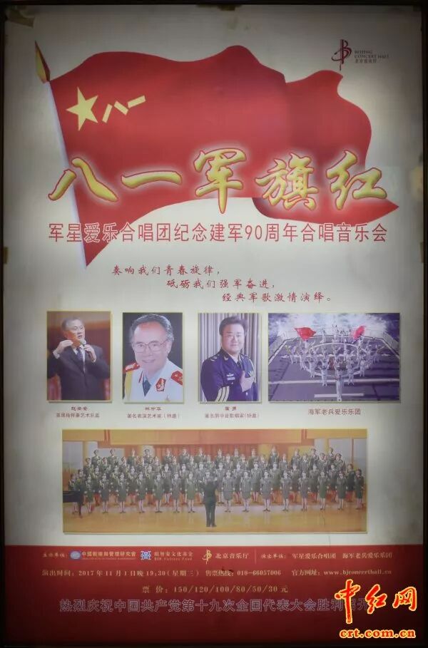 11月1日晚,《“八一军旗红”——军星爱乐合唱团纪念建军90周年合唱音乐会》在北京音乐厅举行。演员们先后表演了混声合唱、配乐诗朗诵、男声合唱、女声合唱、男声独唱等节目。、《八路军军歌》、《新四军军歌》、《娄山关》、《十送红军》等红色旋律,久久回荡在音乐大厅里,受到在场观众的热情称赞与好评。、空军原司令员上将;海军原副政委冷宽中将;北京新四军研究会会长、;八路军研究会会长、;海军工程大学原政委高学敏少将,陈赓大将之女陈知进;肖华上将之女肖霜;人民音乐家郑律成子女郑小提、郑矛等有关领导和革命后代,以及中国合唱协会理事长李培智、付理事长李小祥;中国合唱联盟付主席周国安等领导、著名作曲家甘霖、黄钟声、胡小环、刘璐等合唱音乐界专家也一同观看了演出。