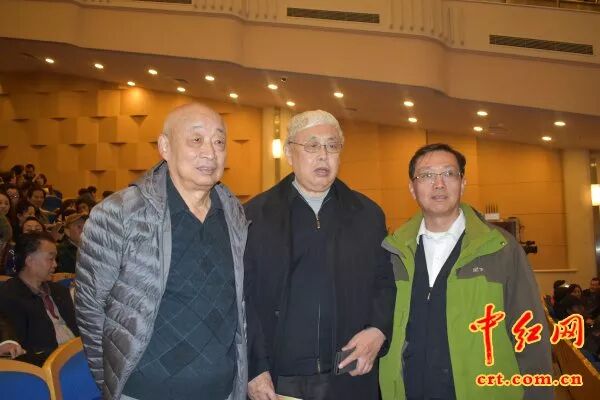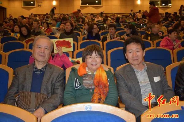 人民音乐家郑律成之女郑小提(中)与中国合唱协会理事长李培智(左)和付理事长李小祥在音乐会上。(中红网布铁威摄)