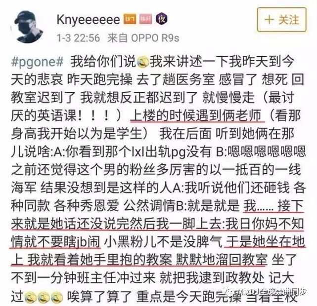 比如这位ID为 @Knyeeeeee 的粉丝,据她描述1月2号下午,因为听到两个老师在讨论八卦,于是她一脚踹上去,把老师踹倒在了地上,并怒骂:“我r你妈不知情就不要瞎jb闹” ▽