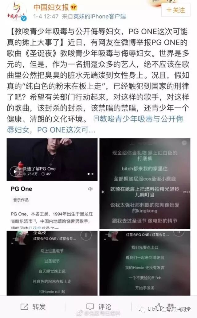 昨天下午,《中国妇女报》发表声明,称PGOne的歌曲《圣诞夜》教唆青少年吸毒与侮辱妇女,呼吁有关部门 “该封杀的封杀,该禁唱的禁唱” ▽