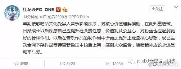 昨天下午,PGOne在微博上道歉,说自己早期受黑人音乐影响深厚,对核心价值理解偏颇,所以才会写成这样 ▽