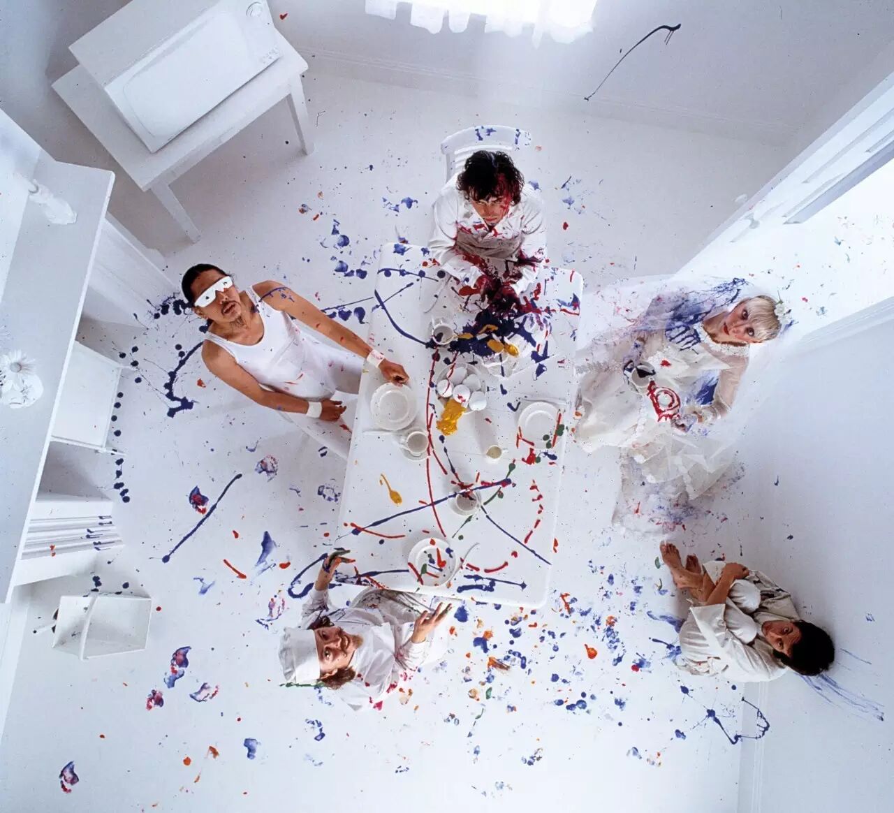 我们把摄影棚做成起居室的模样。,所有东西都涂成白的。我们一点点泼洒原色水彩,Gered把各种颜色的颜料管拿给我们,有黄色,蓝色,红色和绿色。