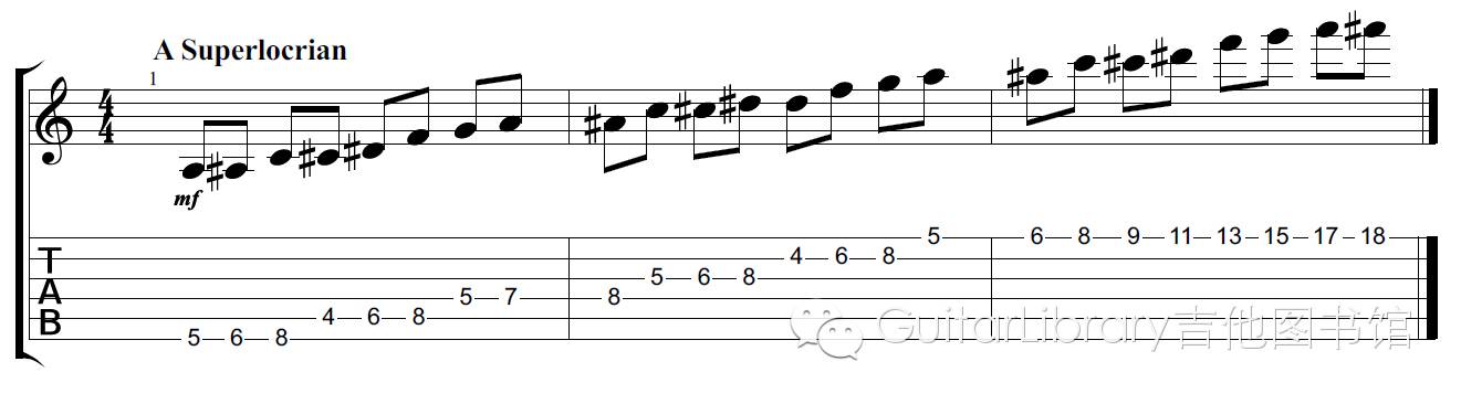 乐句第二拍开始我使用了Superlocrian音阶(超级洛克利亚)我们发现很多演奏fusion的吉他手都喜欢这样的音阶,比如:frank gambale,Tom Quayle, Greg Howe,Alex Hutchings等等。 这种音阶特别适合用来制造一定的紧张感,其实通常用在b9 7 #9 等和弦上方来用,但是有时候我在演奏小调和弦时,也会把它当成属和弦来演奏,其效果也会比较容易制造出矛盾感,让人眼前一亮的感觉,当然,它们不适合大篇幅的出现在它们“原本不该”出现的地方,那样就显得很怪,起码我个人是这么认为的。好了,后面两拍相对很好解释,我用了半音的趋近和回归性的小调五声,这样让乐句回到相对稳定的“情绪”中,听起来不至于那么突兀,好了,这一期我个人的教学就到这了 ,由于平时较忙,在教学中我尽量给大家提供一些个人的愚见,也希望大家不吝赐教,多多交流学习,关注我们的微信,会有更多,更好的教学与大家见面,我们下期见,祝大家生活愉快,琴技大长!