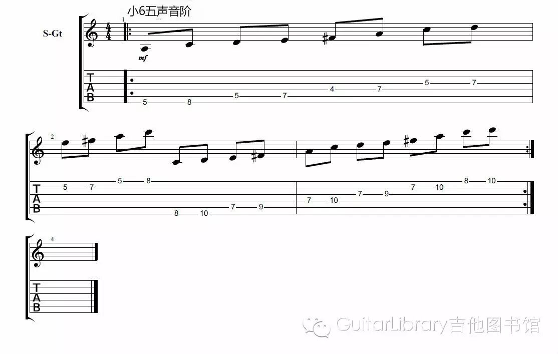 那么好,我们上面基本掌握了关于两种音阶模式的基本演奏和指板上的位置,现在,我们尝试用它们做简单的造句,并且我为大家把它们在乐句中的显著位置标注出来方便大家学习。