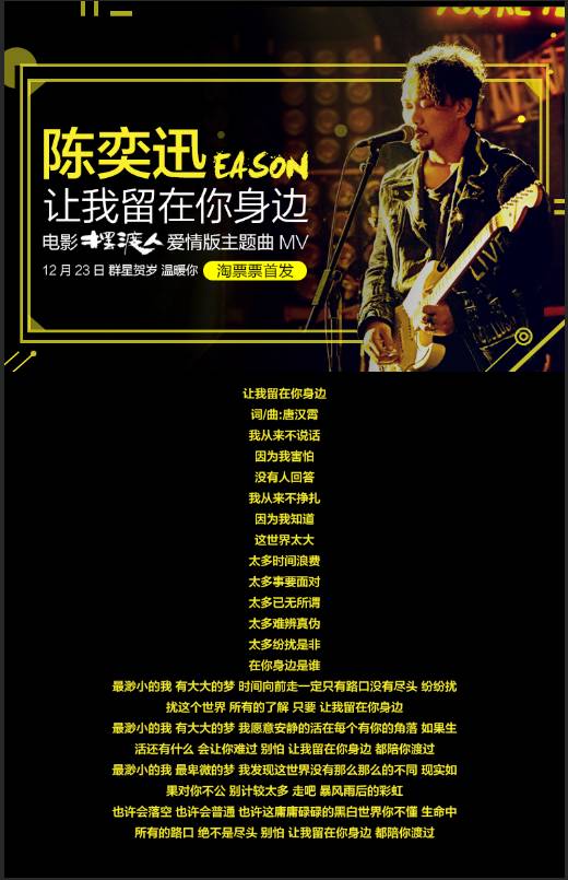 由王家卫监制、张嘉佳执导的贺岁爱情喜剧《摆渡人》将于2016年12月23日全国上映。日前,片方发布了电影爱情版主题曲《让我留在你身边》,陈奕迅重磅献声!一听吹神这把好嗓,票叔已经控几不住我记几想剁手买票了!