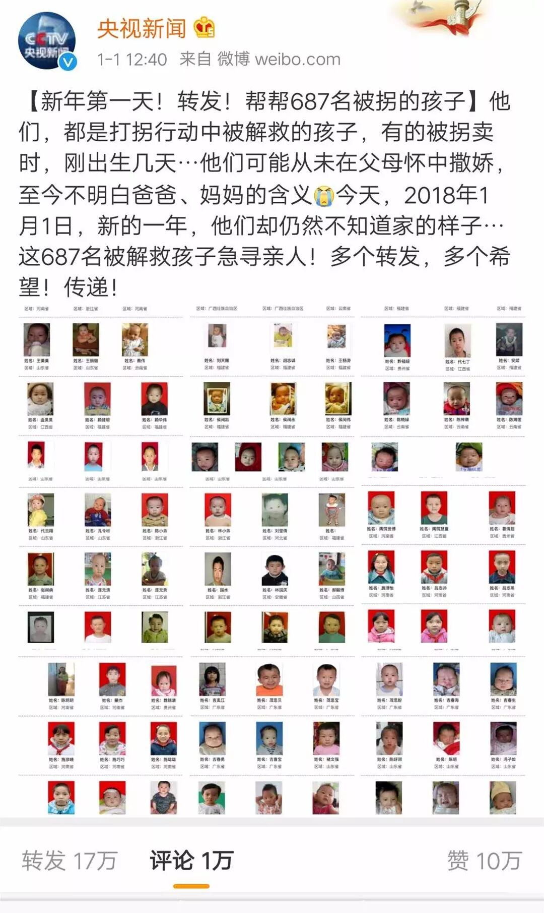微博上公布了最新的687名被警方解救的被拐儿童,有点孩子刚出生没多久就被拐卖,甚至有被拐孩子遭逼迫去偷窃,他们可能从未有机会在妈妈怀中撒娇…