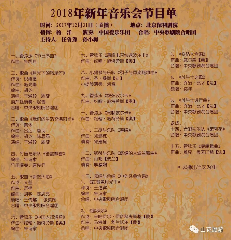 《2018新年音乐会》特别节目由任鲁豫、孙小梅担任主持人,于2017年12月31日19:30在音乐频道直播,由中国爱乐乐团、中央歌剧院合唱团、指挥家杨洋携国内顶尖演奏家、歌唱家,为您奏响中国交响最强音,听世界的中国之声,欢迎观看: