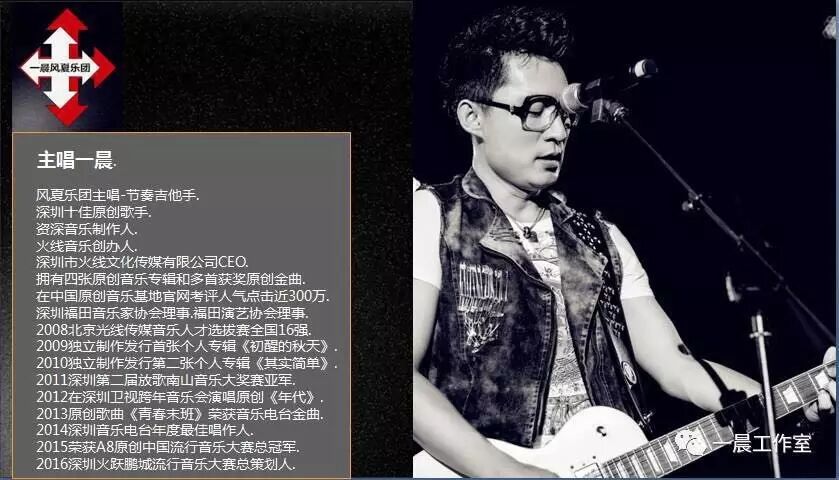 一晨风夏乐团,是由深圳音乐唱作人一晨发起组建的一支全新摇滚劲旅。在音乐方向上,一晨始终坚持以流畅自如的旋律为主线,搭配力度强悍的节奏和更加丰满的摇滚结构,使得乐团的原创作品在听觉上更加极速动听并赋有张力。