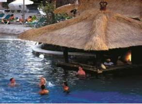 巴厘岛最大的游泳池,占地0.9公顷,整个泳池都是仿沙滩海滨建造的,弯弯的泳池边上有35间独立的小木屋,非常适合情侣度假,在烈日炎炎中寻得一片荫凉与幽静。木屋里的家具设施一应俱全有桌椅、床榻,客人甚至可以在这里享受池畔的客房服务,或按摩、水疗护理,还可以在里面就餐。