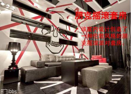 该室内设计创造了一种伦敦风格的朋克摇滚派对套房。
