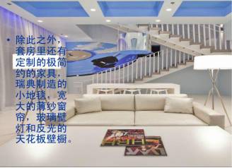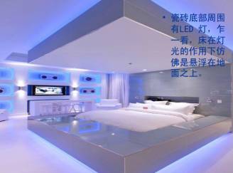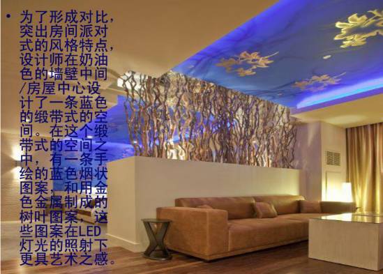 该室内设计创造了一种现代化、迈阿密感觉的派对式套房。套房整个布局像一个派对休闲室,它的一个主要的特点就是有一个巨大的C型的床,床周围装有进口的蓝色的意大利瓷砖。