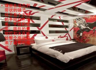 镶嵌在墙内的带状的镜子,位于各个方向的手绘红色线条、手绘的壁画、圆形的照明灯和天花板给整个房间带来了动感的感觉。