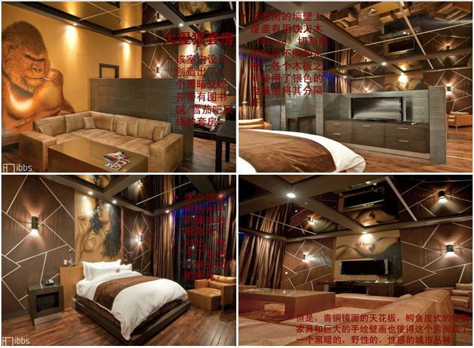 青铜镜面的天花板、鳄鱼皮式的特制家具和巨大的手绘壁画也使得这个房间成了一个