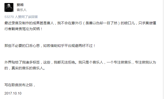 10.10凌晨 00:10 分,窦唯在知乎上回答了《窦唯目前在干什么?》的问题,全文仅 144 个中文字符,截止到目前共获得超过 5万次赞,而该问题也已经被网友浏览 350 万多次、评论超 6000条。