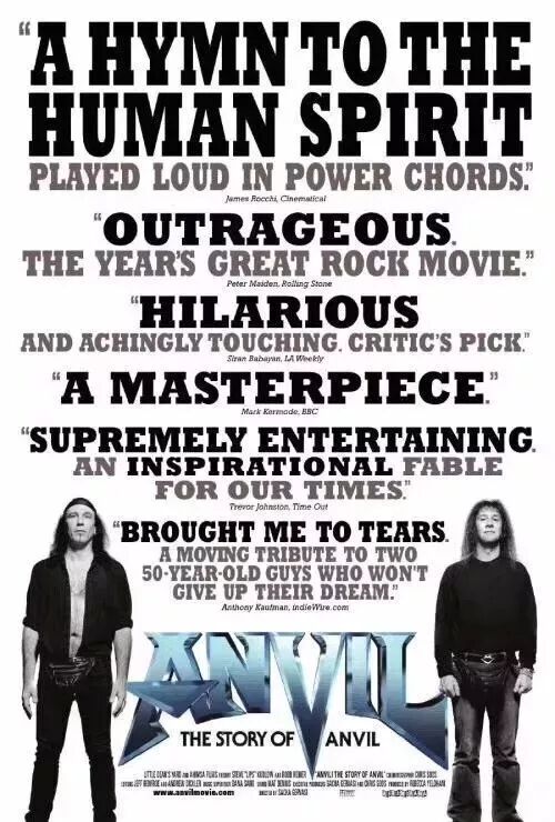 全世界再次知道他们,是通过一部纪录片《金属精神 Anvil! The Story of Anvil》,在全球超过1500万人观看过。几位乐手对重金属音乐的痴迷和对梦想追求的精神非常感人。40年过去,他们仍然在坚持做自己喜欢的音乐。Anvil的故事激励了不仅仅是音乐人,也影响到每一个有梦想的人。
