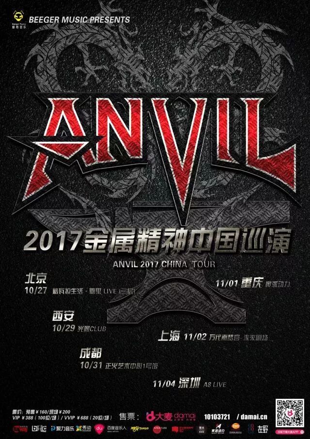 ANVIL铁砧乐队《金属精神》中国巡演现已全面开票,票价:¥160、¥200、VIP¥388.