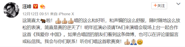 看完视频的原唱汪峰甚至在微博“求联系”,邀请他们上演唱会现场合作《我爱你中国》!