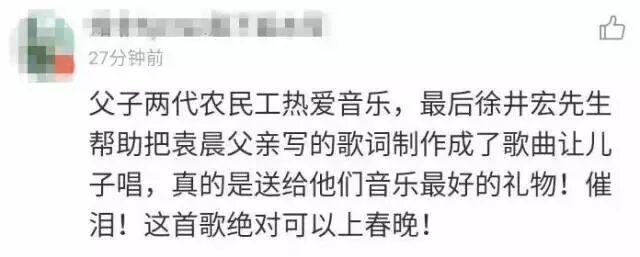 在央视财经频道《城市梦想》直播间,徐井宏说了段话:“我在某一刻特别感动,就是他父亲谈到歌的时候。我从他眼里看到一种神采,是回忆也好,是向往也好,无论人在什么时候,总有种力量在支撑他。多么朴素的《农民工》!走南闯北不怕那累,忙忙碌碌是我们农民工……在那一刻我就决定了要做的第一个事,就是要圆他父亲的一个梦,所以我回来就马上找人给他谱了个曲子。”