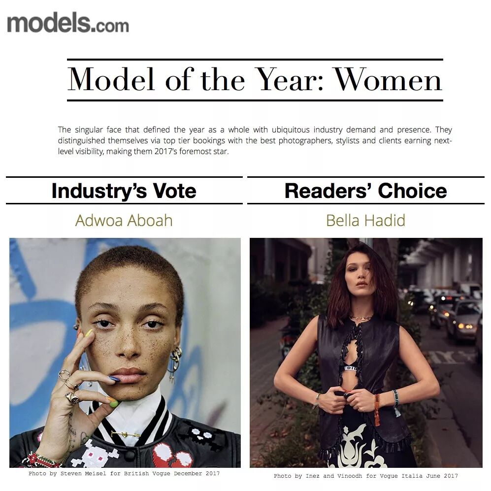 权威模特网站models.com出炉了新一年的“年度女模特”,业内评选第一名由今年大火的雀斑模特Adwoa Aboah获得。读者评选的冠军则是网红超模Bella Hadid。