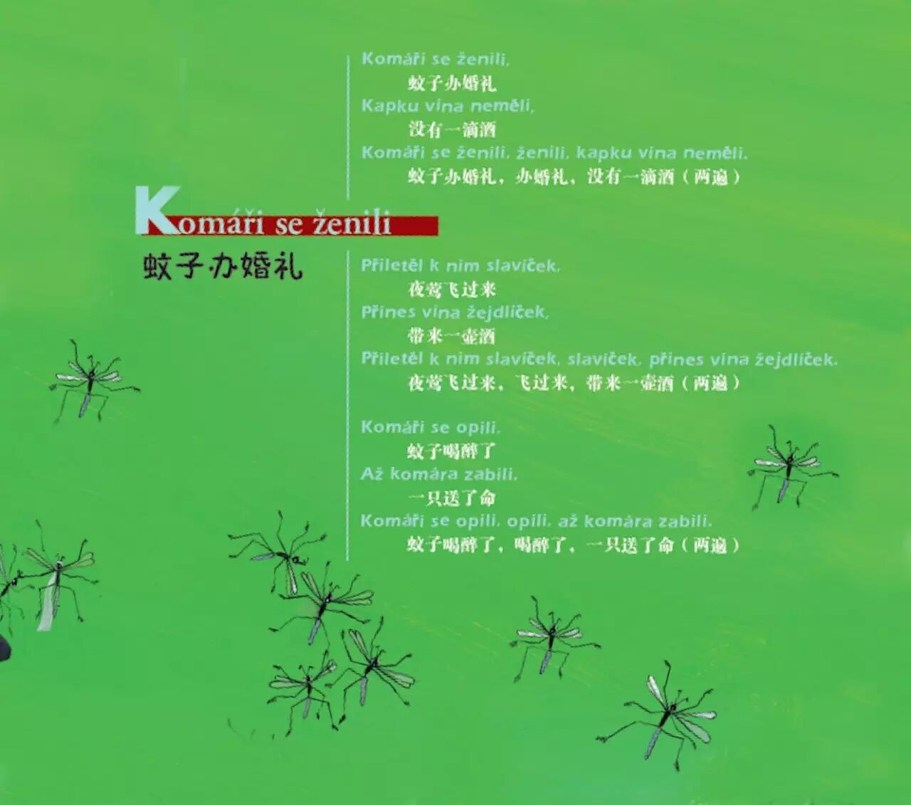 这首诙谐幽默的波西米亚歌曲深受小朋友们的欢迎。歌词中用拟声词“嗡——嗡——”来模拟蚊子的叫声。简洁的和声是典型的西里西亚曲风。歌中唱道,婚礼上人们饮酒庆贺,然而这样做容易饮酒过量!歌中渗透出寓言故事的精髓。语言来自于口头文学,它赋予动物——这里是蚊子和夜莺——以人的感情与活动,再以滑稽模仿的方式表达寓意。