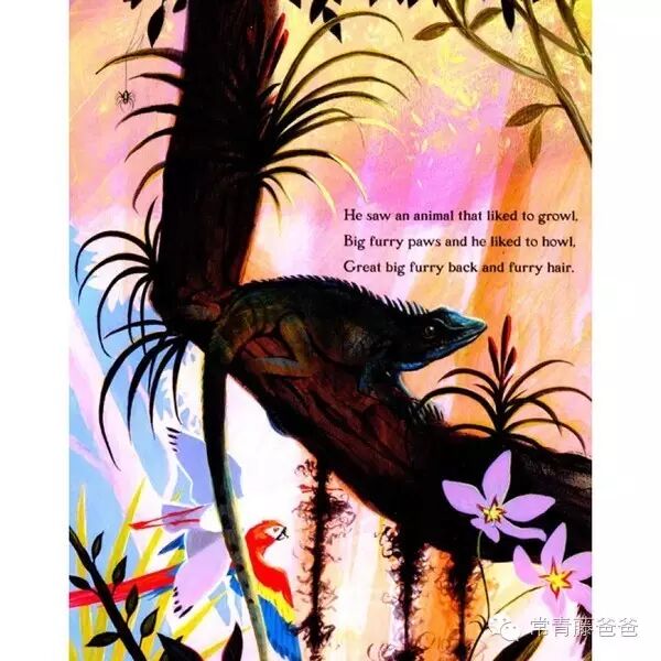 而配合这种鲜活的意象,插画家Jim Arnosky根据歌曲的内容,给孩子呈现出一个色彩斑斓的世界。全书包含170多个动物形象——鳄鱼和海豚游泳;企鹅与老虎、犀牛、巨嘴鸟比肩,丰富多彩的野生动物在视觉效果上完全契合了迪伦的想象世界。