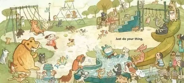插画家Scott Campell 在绘本中将一个无忧无虑的童年的欢乐呈现无遗:一个女孩和她的弟弟在操场上冒险,在沼泽地里恶作剧,他们凝视夜空,他们信步闲游。一路上,越来越多的狗加入到他们的游戏中去……就这样甜蜜、简单的概念,配上画风幽默的水彩图,颇受孩子们的喜爱。