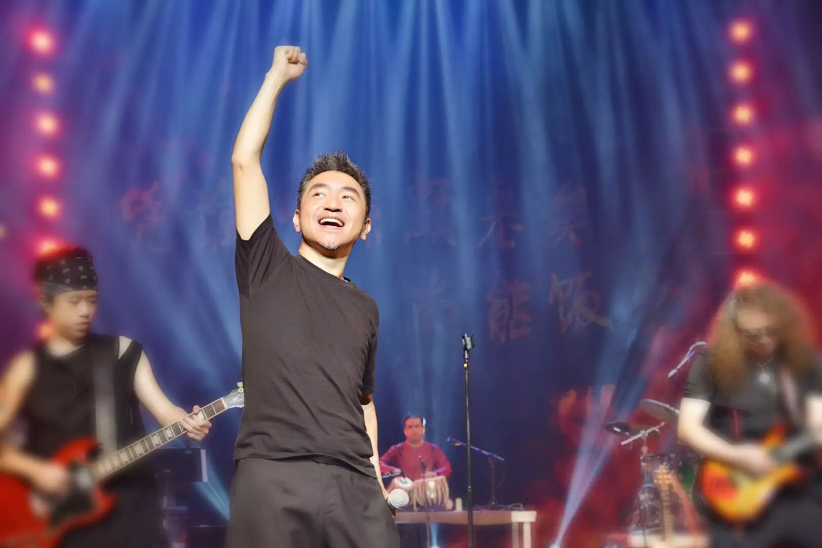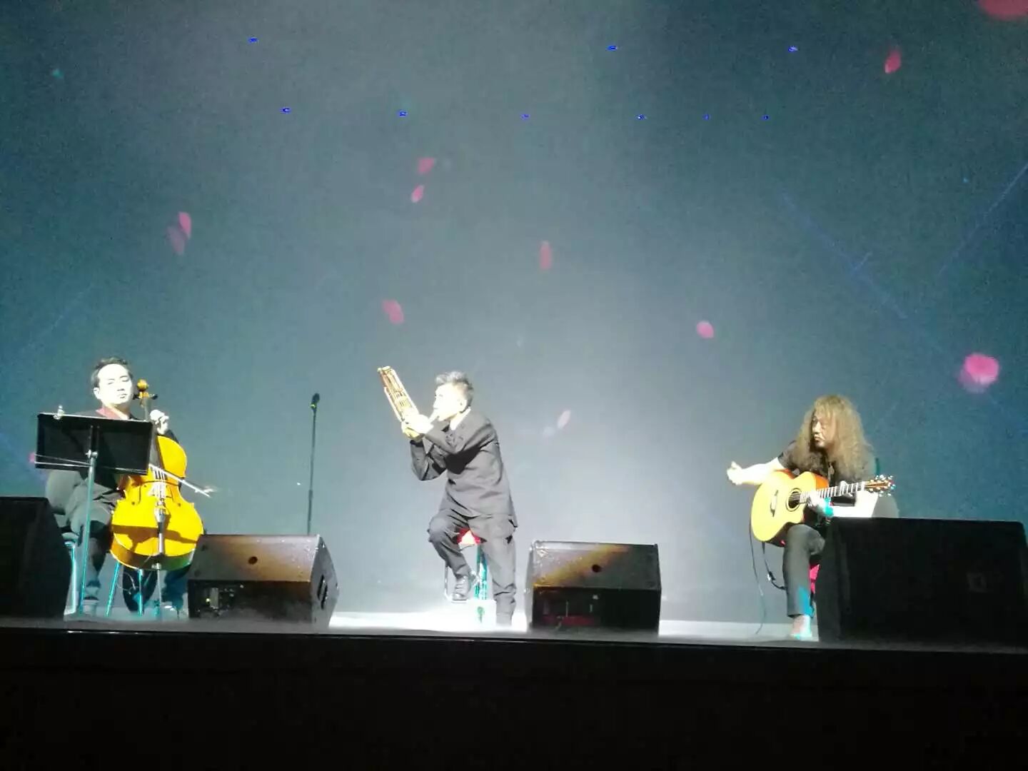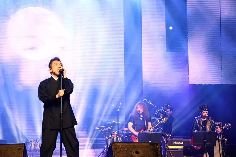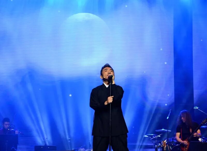 音乐会尾声,吴彤老师携中国笙与琵琶演奏家王帅、唢呐演奏家高岩、胡光辉以及摇滚乐队音乐家们一起为观众演绎了代表作——根据李白和辛弃疾诗词改编创作的《将进酒》和《烽火扬州路》。两首作品五音繁会,气象不凡,古诗词的豪放不羁加上吴老师声音中的潇洒本性,使整个剧场都“燃”了起来。观众们已不再矜持的坐在座位上欣赏,而是用“与君歌一曲,请君为我倾耳听”的行动来回应台上的精彩。全场一同高歌“五花马,千金裘,呼儿将出换美酒,与尔同销万古愁,万古愁”,应景的古词使许多观众为之激情澎湃。而此时,曲已告终,情犹未尽,犹记烽火,来年再会!