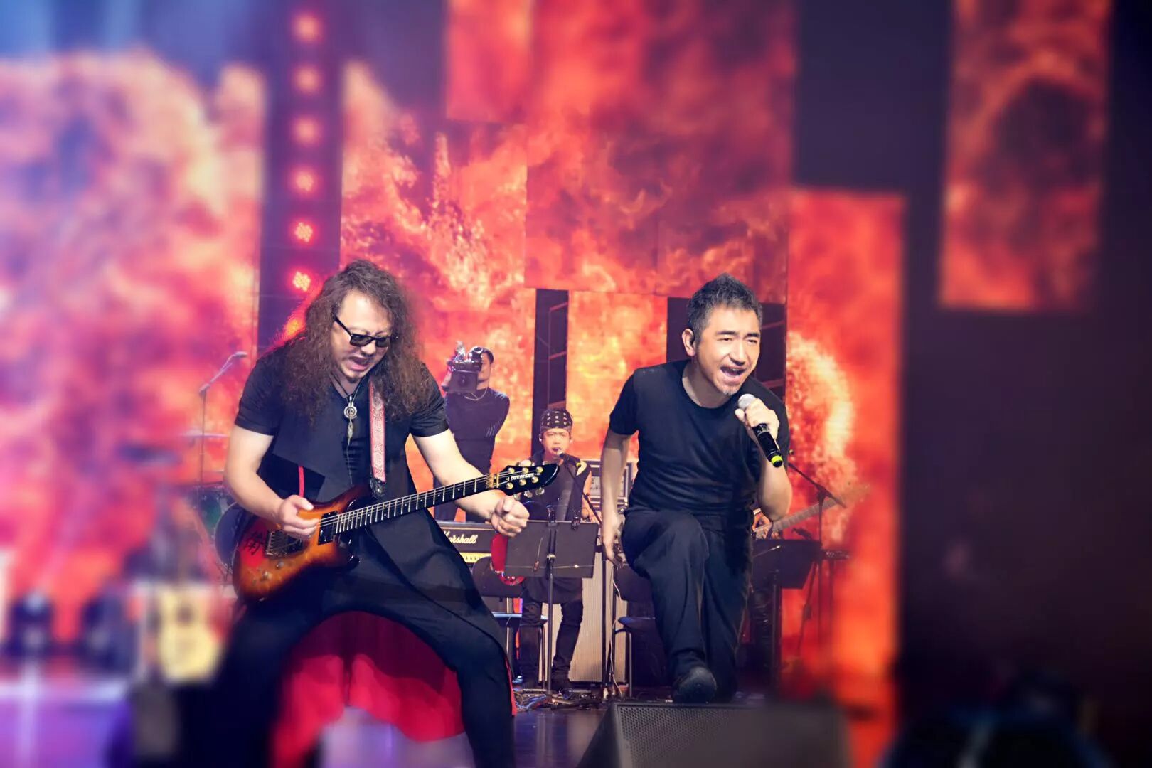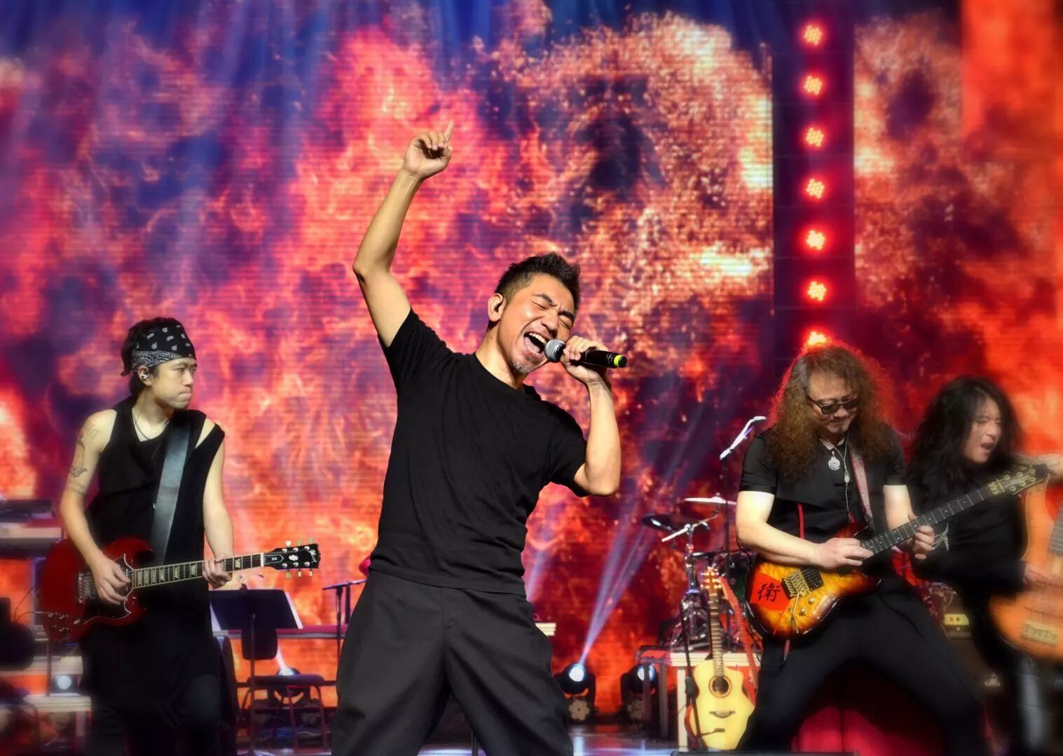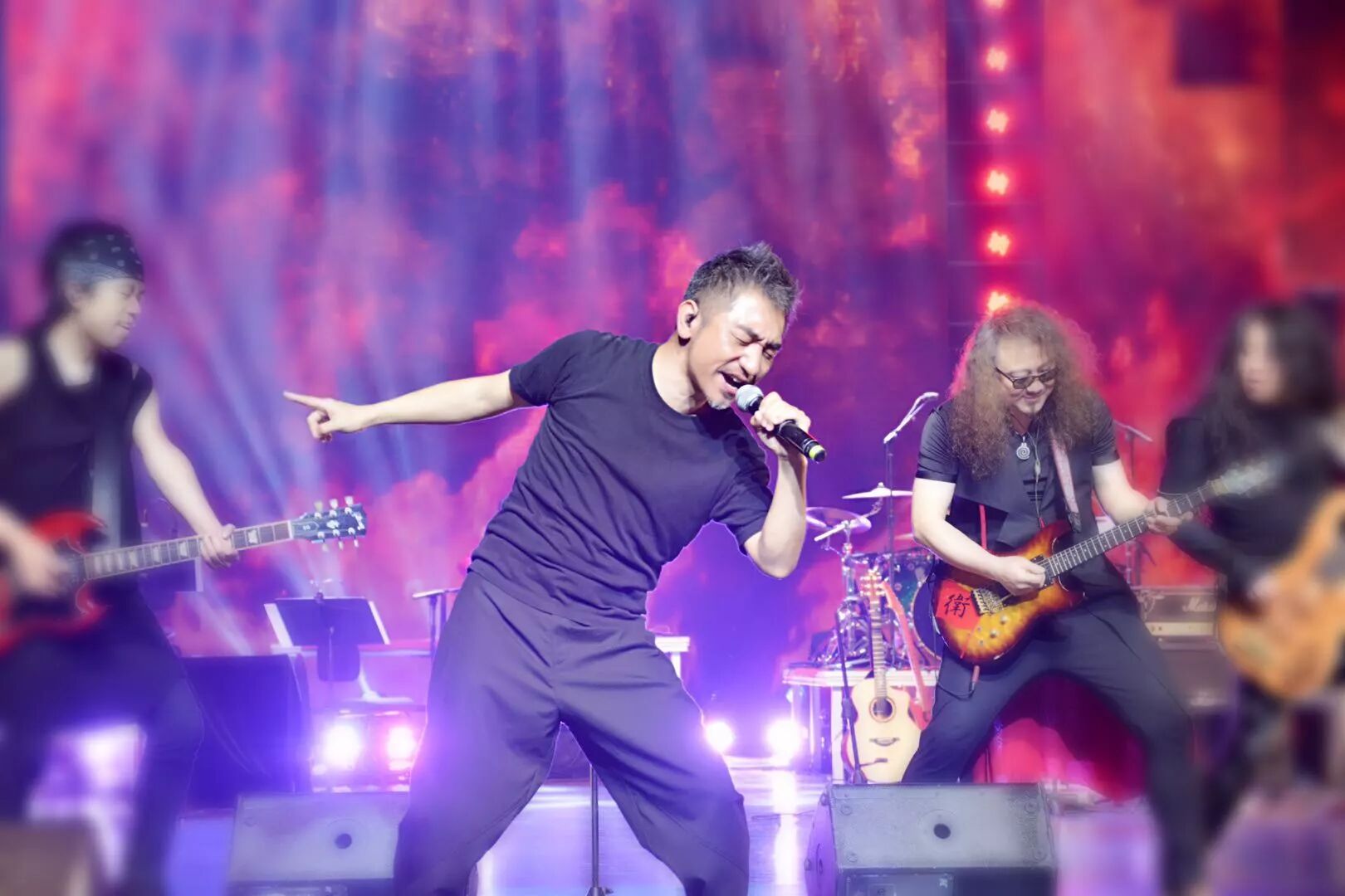 音乐会尾声,吴彤老师携中国笙与琵琶演奏家王帅、唢呐演奏家高岩、胡光辉以及摇滚乐队音乐家们一起为观众演绎了代表作——根据李白和辛弃疾诗词改编创作的《将进酒》和《烽火扬州路》。两首作品五音繁会,气象不凡,古诗词的豪放不羁加上吴老师声音中的潇洒本性,使整个剧场都“燃”了起来。观众们已不再矜持的坐在座位上欣赏,而是用“与君歌一曲,请君为我倾耳听”的行动来回应台上的精彩。全场一同高歌“五花马,千金裘,呼儿将出换美酒,与尔同销万古愁,万古愁”,应景的古词使许多观众为之激情澎湃。而此时,曲已告终,情犹未尽,犹记烽火,来年再会!