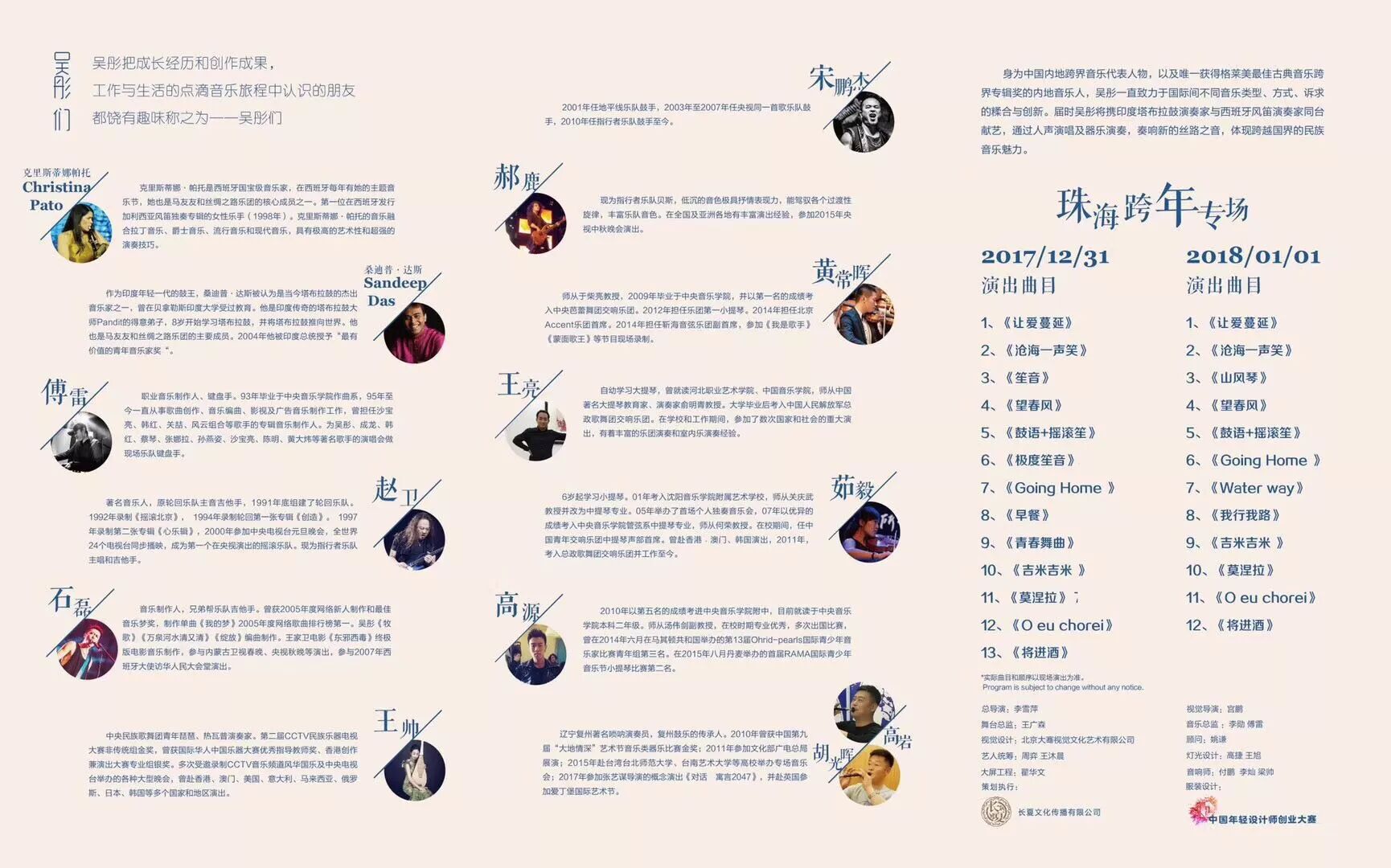 2017年12月31日-2018年1月1日在跨年夜和新年夜里,笙演奏家,跨界音乐人吴彤老师,相邀十多位来自不同国家的艺术家友人,用摇滚元素与古代文化,作为一种文化交流传递的信使,在不同音乐形式间沟通,穿梭在古老文化与现代文明之间,通过编曲雕刻出内容丰富的舞台音乐,为珠海观众呈现出两场多元音乐文化的新年音乐会。