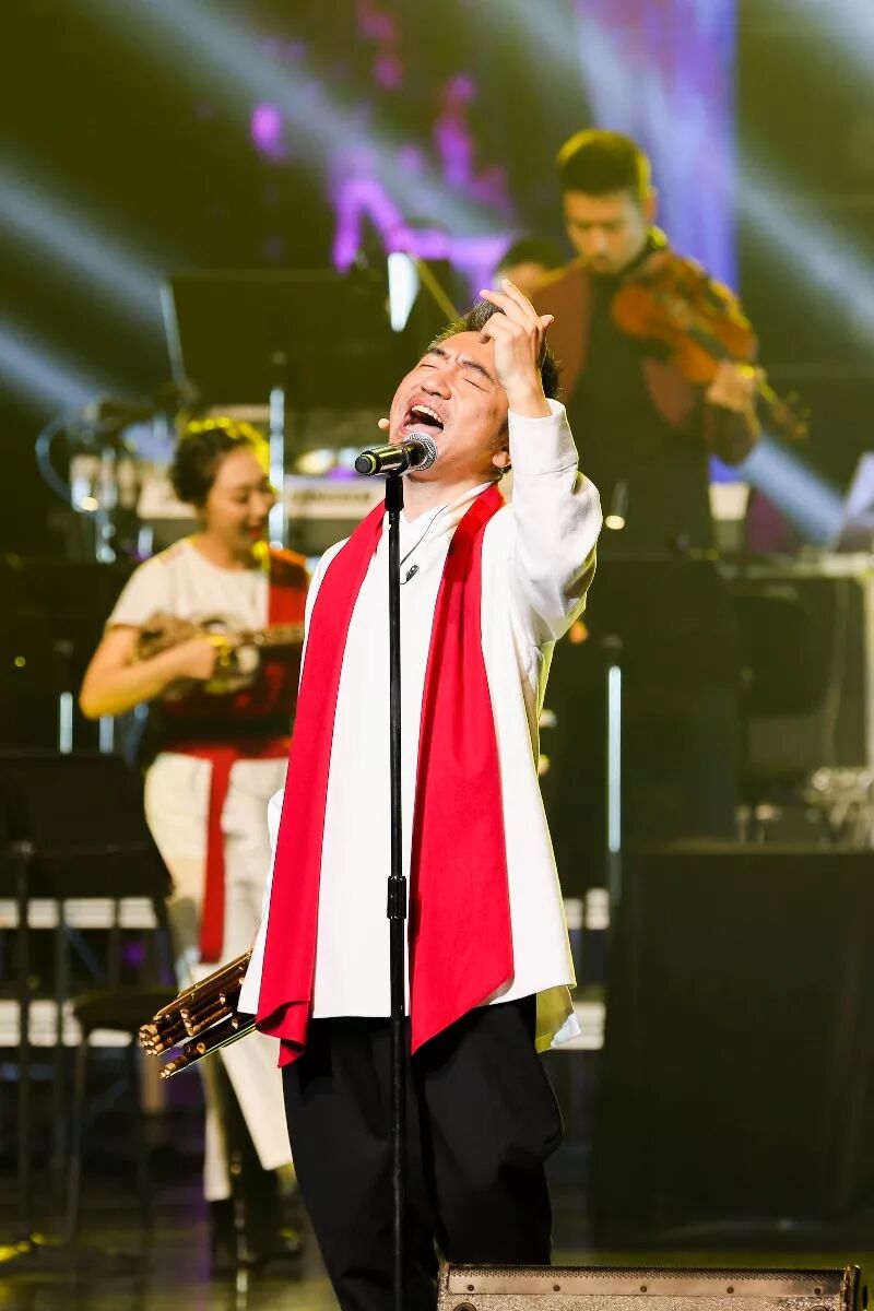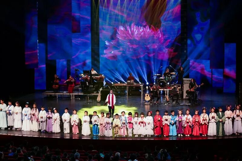 本次新年音乐会融合了灯光在视觉艺术上的呈现,首演原创曲目《让爱蔓延》在幻如仙境般的视觉效果中揭开面纱。随着轻盈明快的鼓点和键盘弦乐的搭配,吴彤老师在仙雾缭绕的视觉环境里,化身音乐旅途的向导,带领大家从东海岸边穿越山海之间,沿着“丝绸之路”的足迹一路向西,开启一段音乐之旅,让音乐渐强,将友爱蔓延。