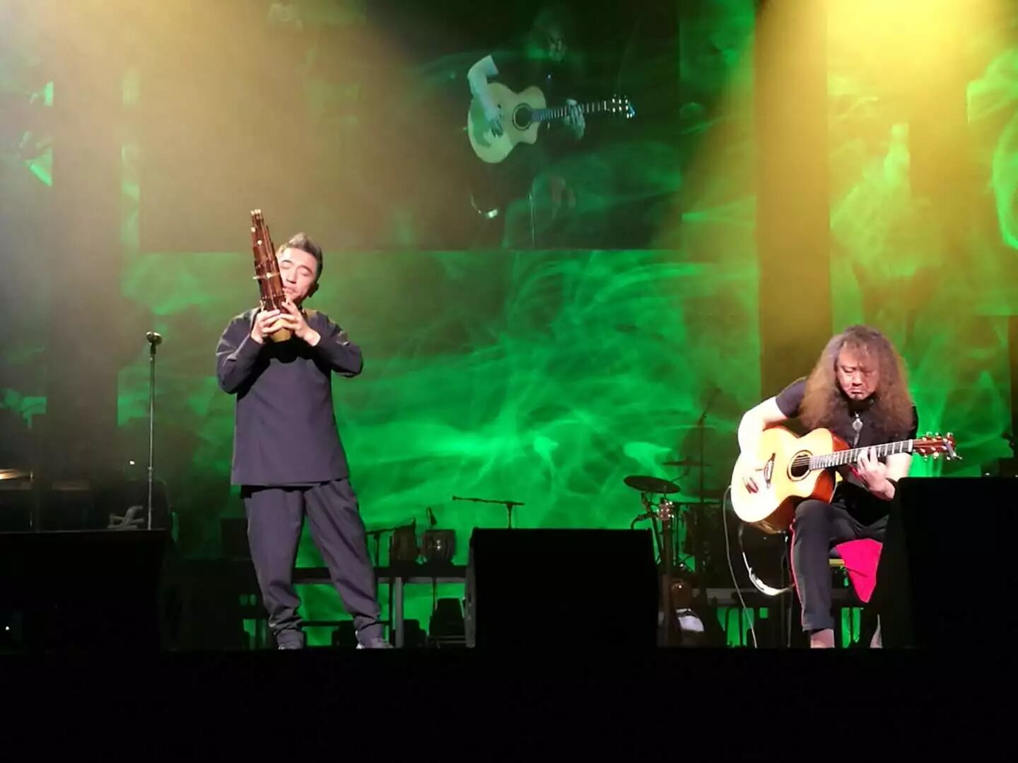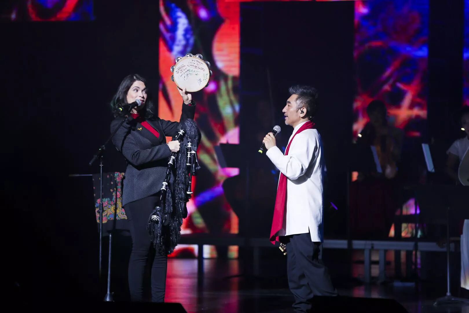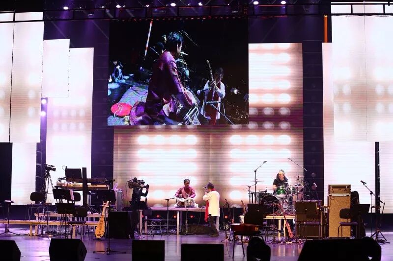 在“丝绸之路”的概念下,观众们跟随吴彤老师的音乐来到了中亚,领略热瓦普和塔布拉鼓的魅力。印度“鼓王”Sandeep先生用传统塔布拉鼓叫板阿鹏老师的现代鼓,两人相互斗鼓的live立刻引发一连串喝彩与掌声;吴老师的人声加载王帅老师的热瓦普搭配现代乐器将《青春舞曲》重新编排后,欢快的节奏使观众们想跟随这支青春舞曲舞动起来,笙音的加入更增添了乐器与乐器、乐器与乐曲间的和谐,令人耳目一新。而大提琴演奏家王亮与中提琴演奏家茹毅,搭配赵卫老师的单簧管与石磊老师的吉他组合,演绎经“丝路乐团”改编自捷克作曲家德沃夏克的古典乐作品《Going Home》。吴老师中英文双语的温情演唱,让珠海观众在家门口欣赏到来自格莱美的获奖专辑音乐,营造出一种安谧祥和的氛围,引领观众回归家庭,回归本心。