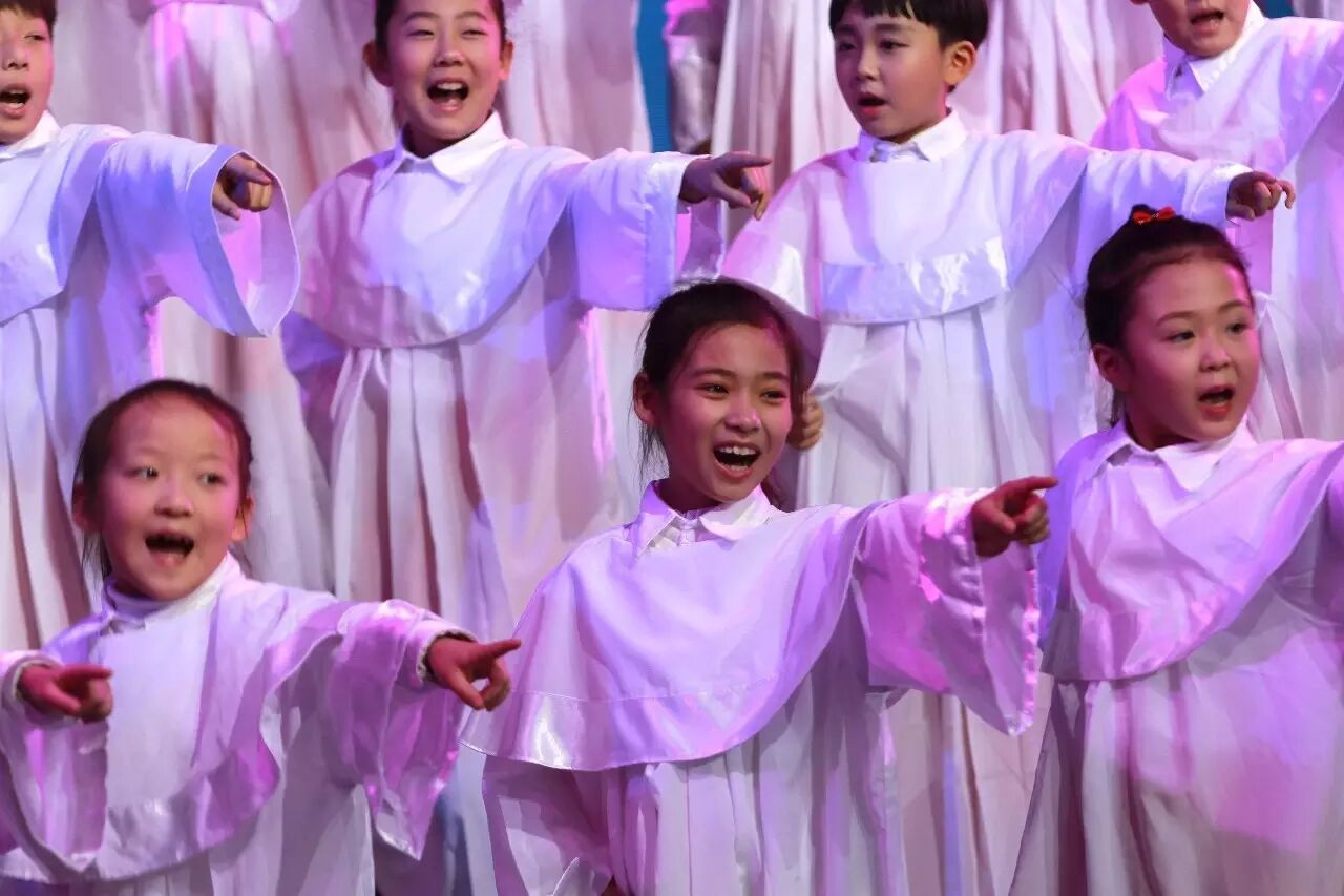 合唱团53名孩子接连演唱了《You Raise me up》《A Little love》《Flying Free》等15首经典英文歌曲。孩子用歌声和舞蹈表达了心中对于世界的感恩与热爱。当《Rocking around the Christmas tree》的音乐响起时,孩子的身体随着音乐摆动,用标准的英文诠释着美妙的乐曲。在唱到经典曲目《MAMMA MIA》时,现场观众也被欢快的音乐感染,起立随着音乐节拍鼓掌。