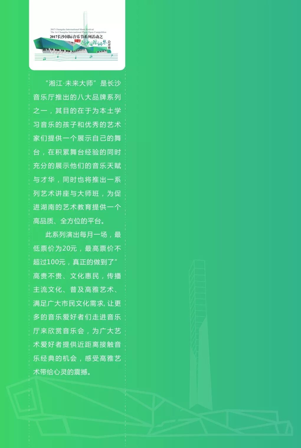 “湘江·未来大师“是长沙音乐厅推出的八大品牌系列之一,其目的在于为本土学习音乐的孩子和优秀的艺术家们提供一个展示自己的舞台,在积累舞台经验的同时充分的展示他们的音乐天赋与才华,同时也将推出一系列艺术讲座与大师班,为促进湖南的艺术教育提供一个高品质、全方位的平台。此系列演出每月一场,在每月第三个周末举行,最低票价为20元,最高票价不超过100元,真正的做到了”高贵不贵、文化惠民,传播主流文化、普及高雅艺术、满足广大市民文化需求“让更多的音乐爱好者们走进音乐厅来欣赏音乐会,为广大艺术爱好者提供近距离接触音乐经典的机会,感受高雅艺术带给心灵的震撼。