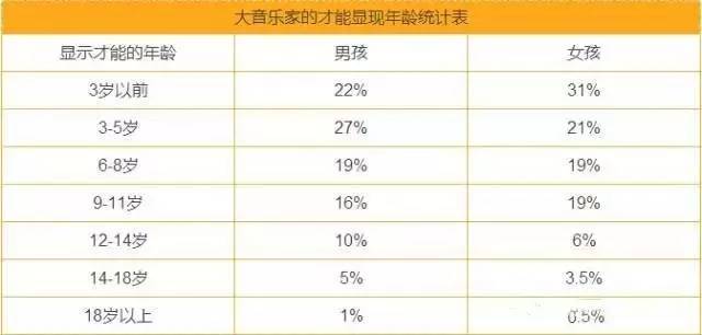 如果一个孩子的音乐潜能较高,往往在很小的时候,就表现出对音乐非常敏感,你放音乐,他会又唱又跳,学歌特别快,而且音准感还比较好,节奏感比较强,这时你可以判断这个孩子是有较好的音乐潜能的。如果孩子在童年的时候,没有这些表现,那他将来成为音乐家的可能性就很小。曾经有一个大音乐家的才能显现年龄的研究发现,杰出音乐家当中,有一半在5岁前,就显示出杰出的才能。
