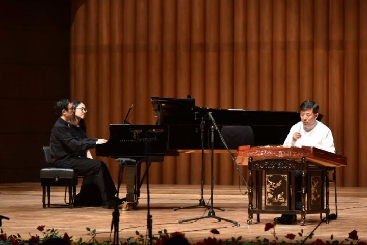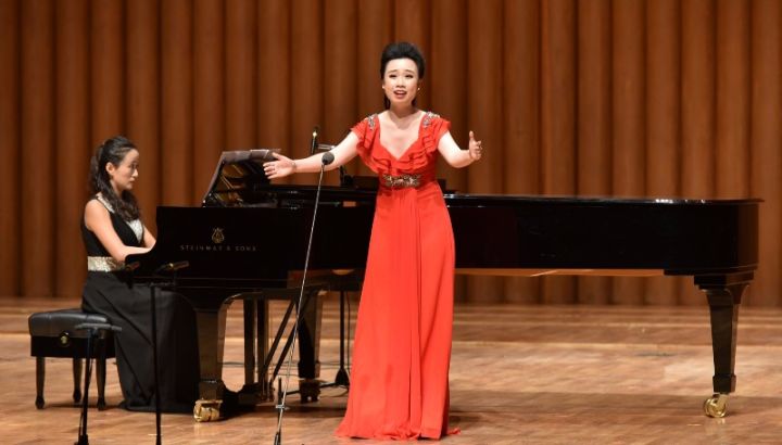音乐会由民乐系老师为观众们带来了《巴蜀歌谣》,乐曲活力四射,瞬间点燃全场热情。接下来是歌剧选段《为艺术,为爱情》。第三个曲目《假面舞会随想曲》由附中的学生演奏,两台钢琴默契地弹出魔幻乐音。接着是由声乐系同学带来的山西民歌《亲圪蛋下河洗衣裳》。