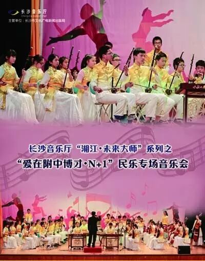湖南师大附中博才实验中学的社团文化丰富多彩,各社团蓬勃发展。民乐团作为学校优秀社团代表,曾赴联合国总部和维也纳金色大厅举行过专场演出。本次在长沙音乐厅举办的长沙音乐厅“湘江·未来大师”系列之——“爱在附中博才·N+1”民乐专场音乐会,既是艺术的盛宴,又是爱心的传递。筹得的全部爱心票款都将用来支持“N+1”专项志愿服务行动,帮扶湖南省孤困儿童。