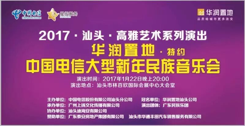 1月22日,作为“2017年汕头高雅艺术系列演出”之一,由华润置地汕头公司独家冠名赞助的“2017中国电信新年民乐巡回音乐会”将在汕头市林百欣会展中心举行。