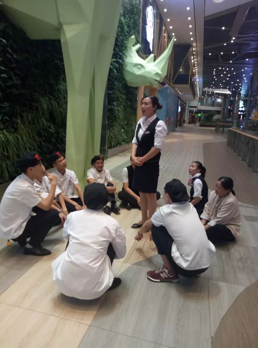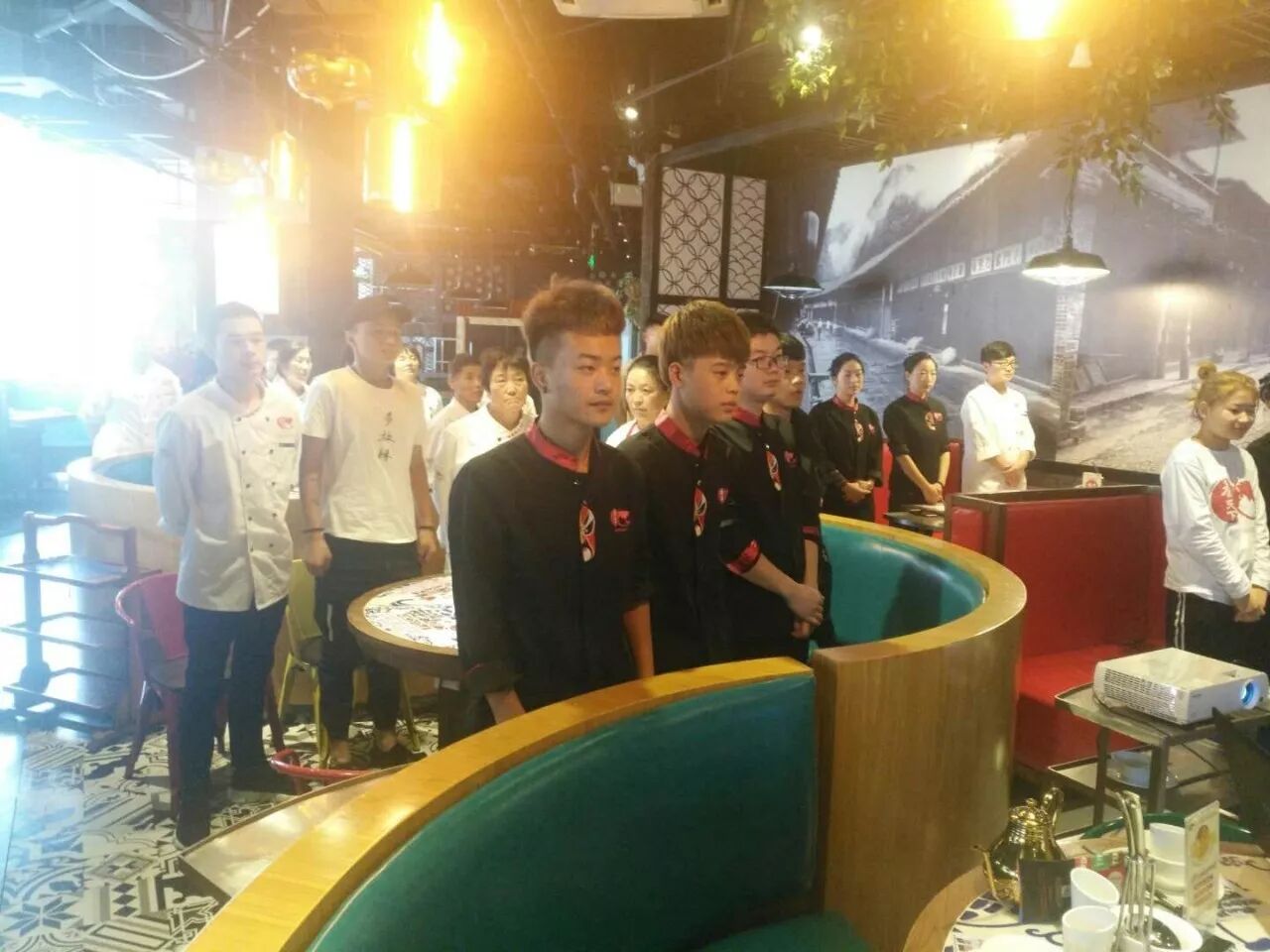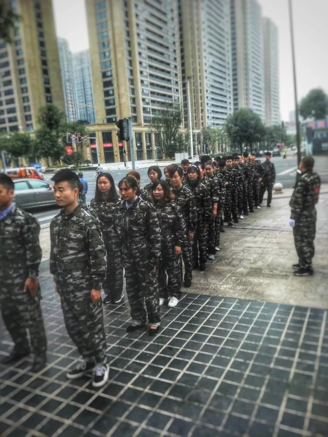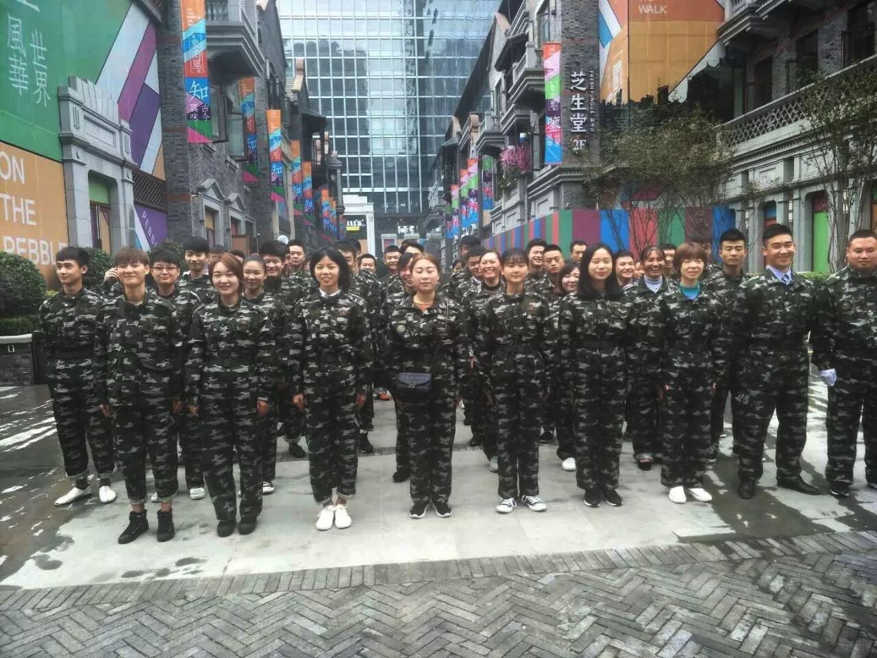 香天下成都象南里员工身着军装召开开业前培训会,通过跑步、喊口号等鼓舞团队士气。