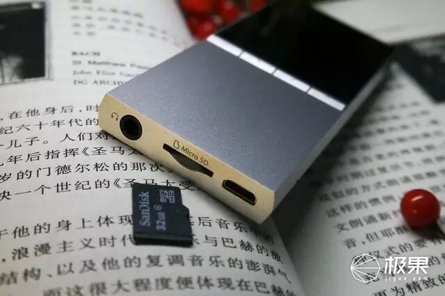 MegaMini的所有接插口全部分布在机器的底侧。左起3.5mm模拟音频插孔;中间系TF存储卡(最大支持256G,MegaMini无内置存储,需另插TF卡作为存储);右为MicroUSB数据充电插口。