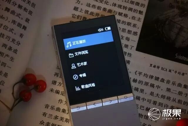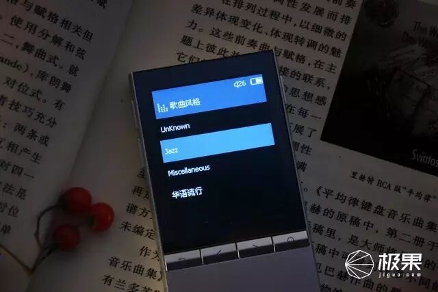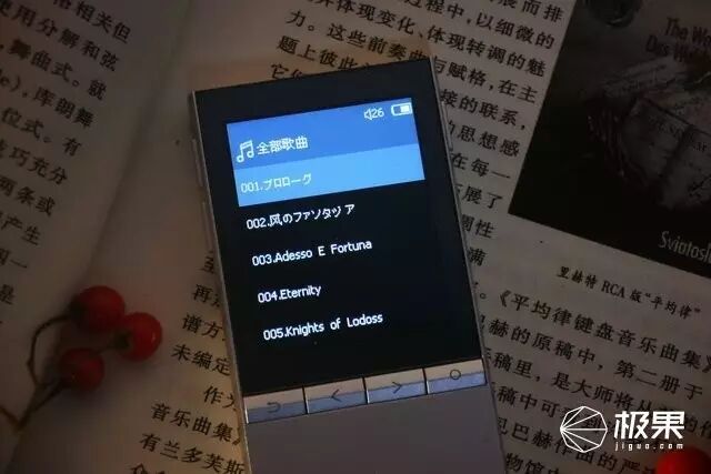 MegaMini的屏幕采用的是LED全彩屏,用尺拉了下屏幕的对角线显示区域,再度娘了下尺寸换算,得出的结果是此屏显示区大小为2英寸。具体准确数据在官方网站也没找到,咱暂且就按2英寸来算吧。从实际使用来看,这个屏的显示效果还算细腻。字体图形都显示得非常清晰。最为关键的是MegaMini支持唱片封面了。不过因为刚到手上,还没找出怎么弄唱片封面,所以它就默认显示下图这种图标了。